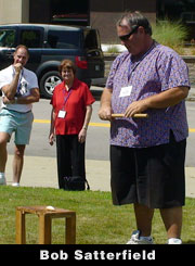 Elaine Johnson announced the winners of the Pee-Wee Contest. Torben Moeller (Be Big Tent, Denmark) sent the pee-wee backwards and received the Horrible Mention award. Third place was Mark Turner (Perfect Day Tent, Ohio), second place was Bob Zeroun (Midnight Patrol Tent, California), and first place went to Stan Strong (Block-Heads Tent, Florida).