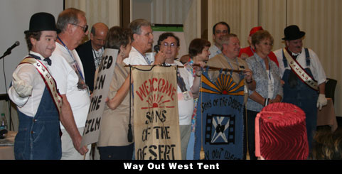 After a break for lunch, everyone returned to the Ballroom for the Parade of Tents lead by Paul Bellefeuille (On the Loose Tent, New Hamshire). The official convention Laurel & Hardy look a likes helped start off the event. The parade was only from the back of the ballroom to the front, but most tents had fun marching the short distance with their tent banners held high. Each tent in attendance sent their representatives to the front of the room for a brief greeting.