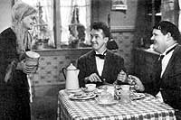 One Good TurnReleased October 31, 1931 (Sound - two reels). When a sweet old lady provides a meal for Stan and Ollie, they overhear a villain threatening to evict her because her mortgage money has been stolen. To help the lady, the boys try to auction their car. A drunk, bidding on the car, accidentally sticks his wallet in Stan's pocket. When Ollie discovers Stan's new found fortune, he turns him over to the old lady as a thief. The result is that Ollie has made a "faux pas," because the old lady was only rehearsing for a play. |
